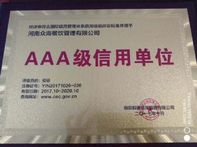 • 18-02-10熱烈祝賀河南眾海餐飲管理有限公司榮獲河南餐飲與飯店協(xié)會(huì)團(tuán)餐委